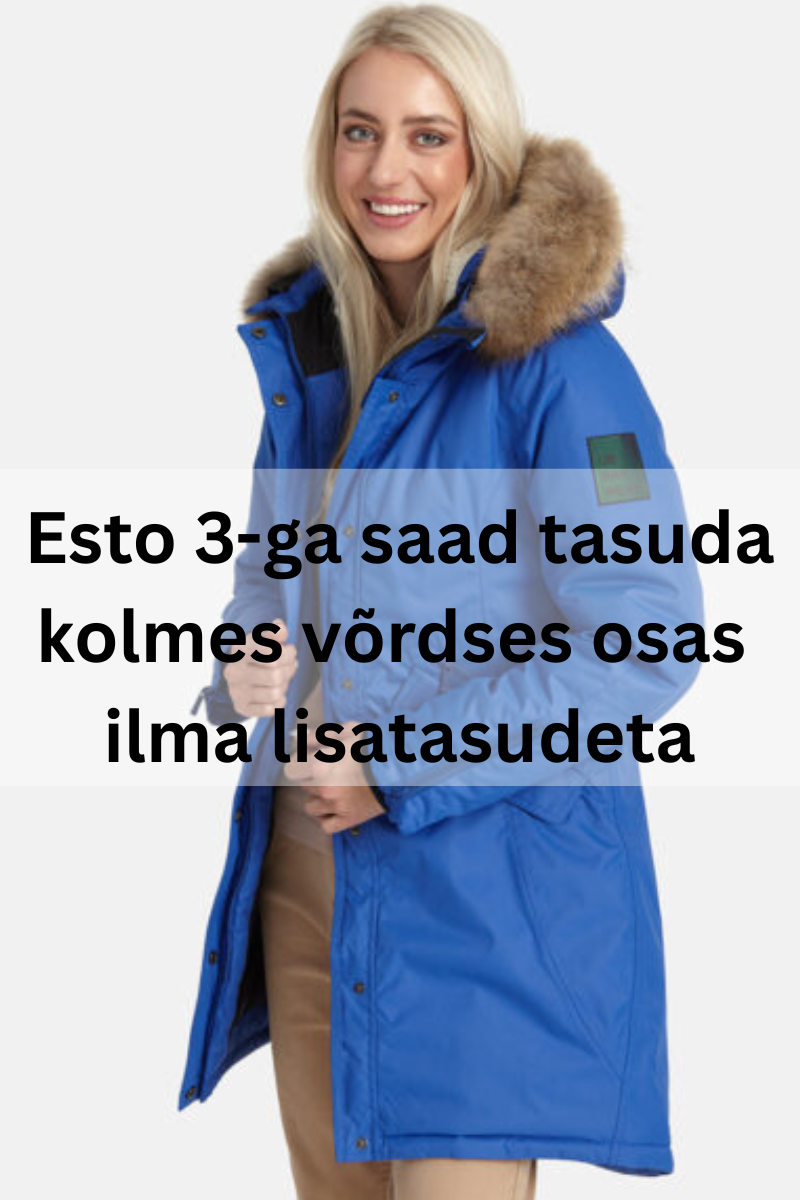 Parka eest saad tasuda ka kolmes võrdses osas ilma lisatasudeta. Vali ostukorvis lihtsalt Esto3 makseviis ja summa jaguneb automaatselt kolme kuu peale. See on mugav viis oma kulutusi hajutada, makstes täpselt sama hinna, mis e-poes.