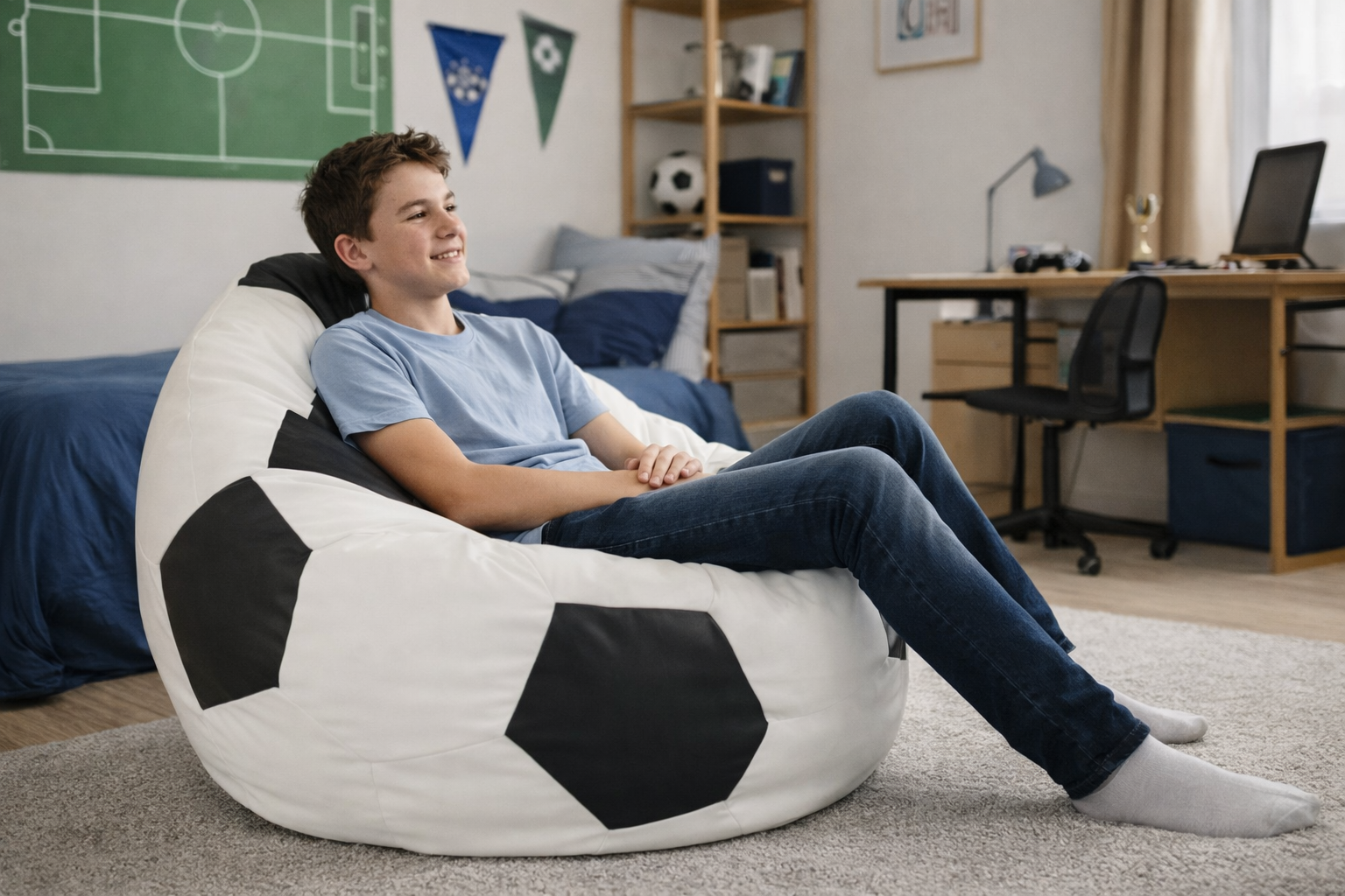 Jalgpall kott-tooli materjaliks on traditsiooniline pehme kunstnahk, mis on ennast tõestanud igal pool-sobib kasutamiseks nii sees kui väljas, talub vett ja suurt kasutuskoormust ning mida on ülimalt lihtne vaid märja lapiga puhastada.Oma veniva sisemise struktuuri tõttu on ta üks parimaid kattematerjale kott-toolidele, vormides ennast just täpselt kasutaja kehakuju järgi.